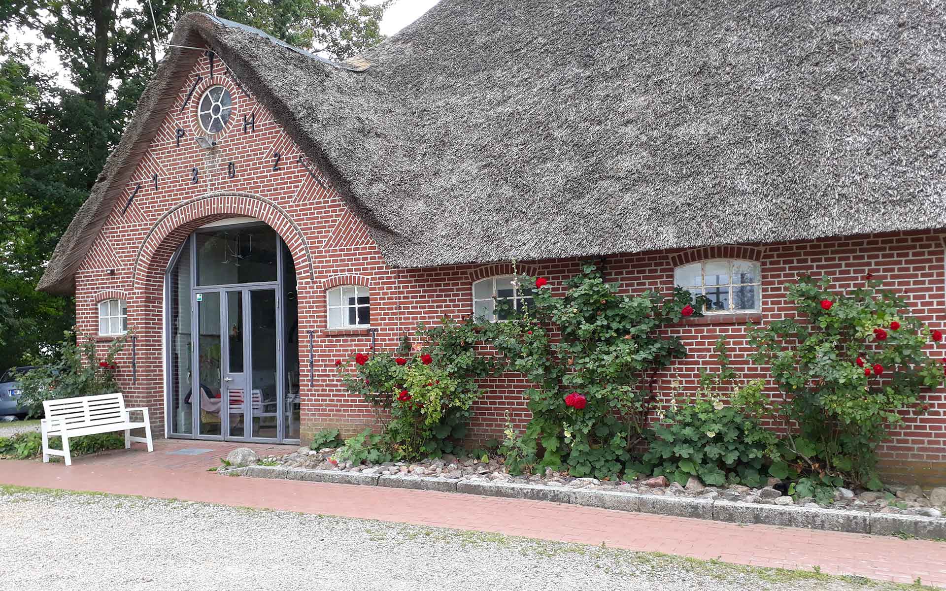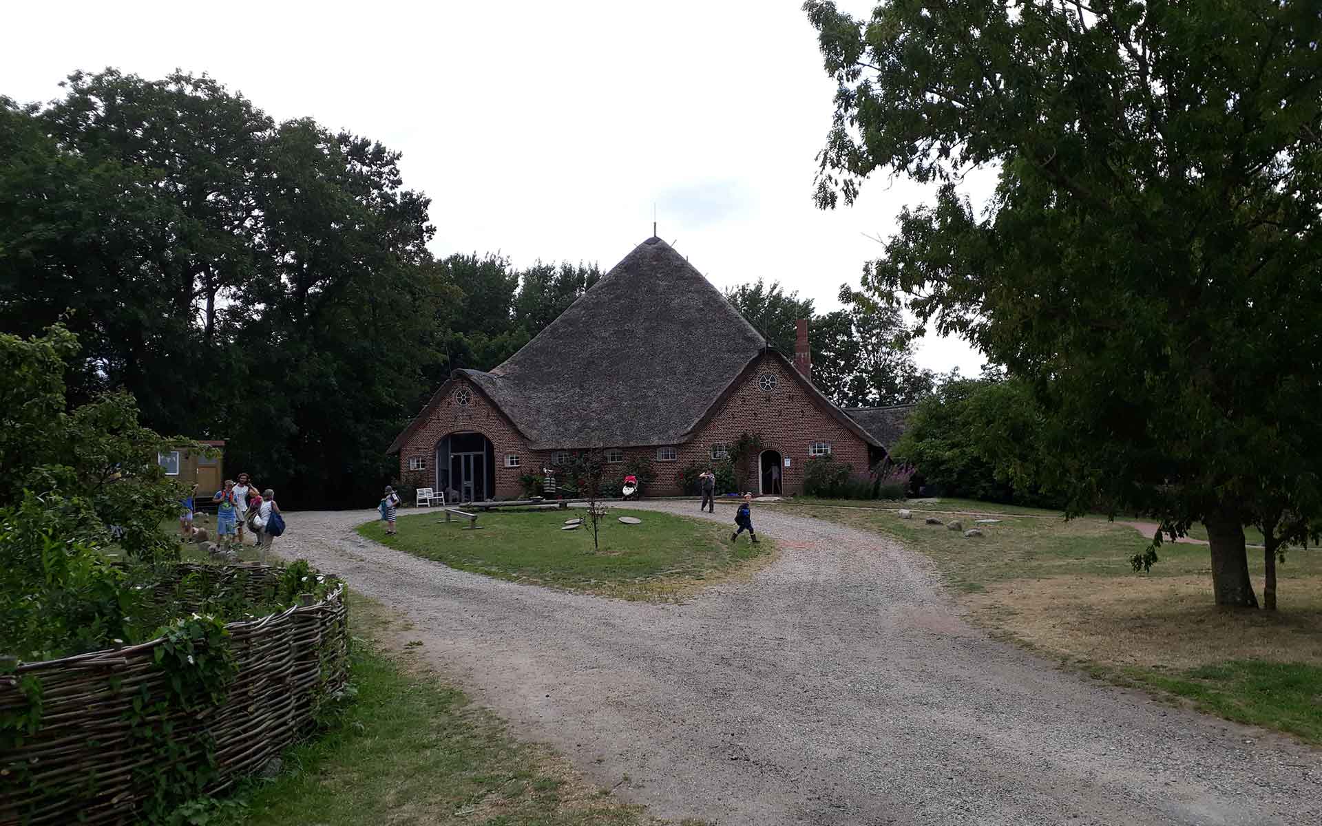 Auf dem Grundstück befindet sich der beindruckende Mars Skipper Haubarg. Das große Bauernhaus ist ein typischer Eiderstedter Haubarg, in dem damals die Bauern mit ihrem Vieh zusammen unter einem Dach lebten. Über den Eingängen sind dreieckige Giebel, die dazu dienten, unversehrt bei einem Brand hinaus zu gelangen. Denn wenn das Reetdach erstmal brennt und hinabfällt, hat man kaum eine Chance. Untypisch sind die Fenster im Giebel des Haubarges. Sie sind eine Sondergenehmigung. Der alte Stalltrakt ist begehbar und Sie finden dort neben dem Shop die Kasse. Der andere Teil des Haubarges ist bewohnt.