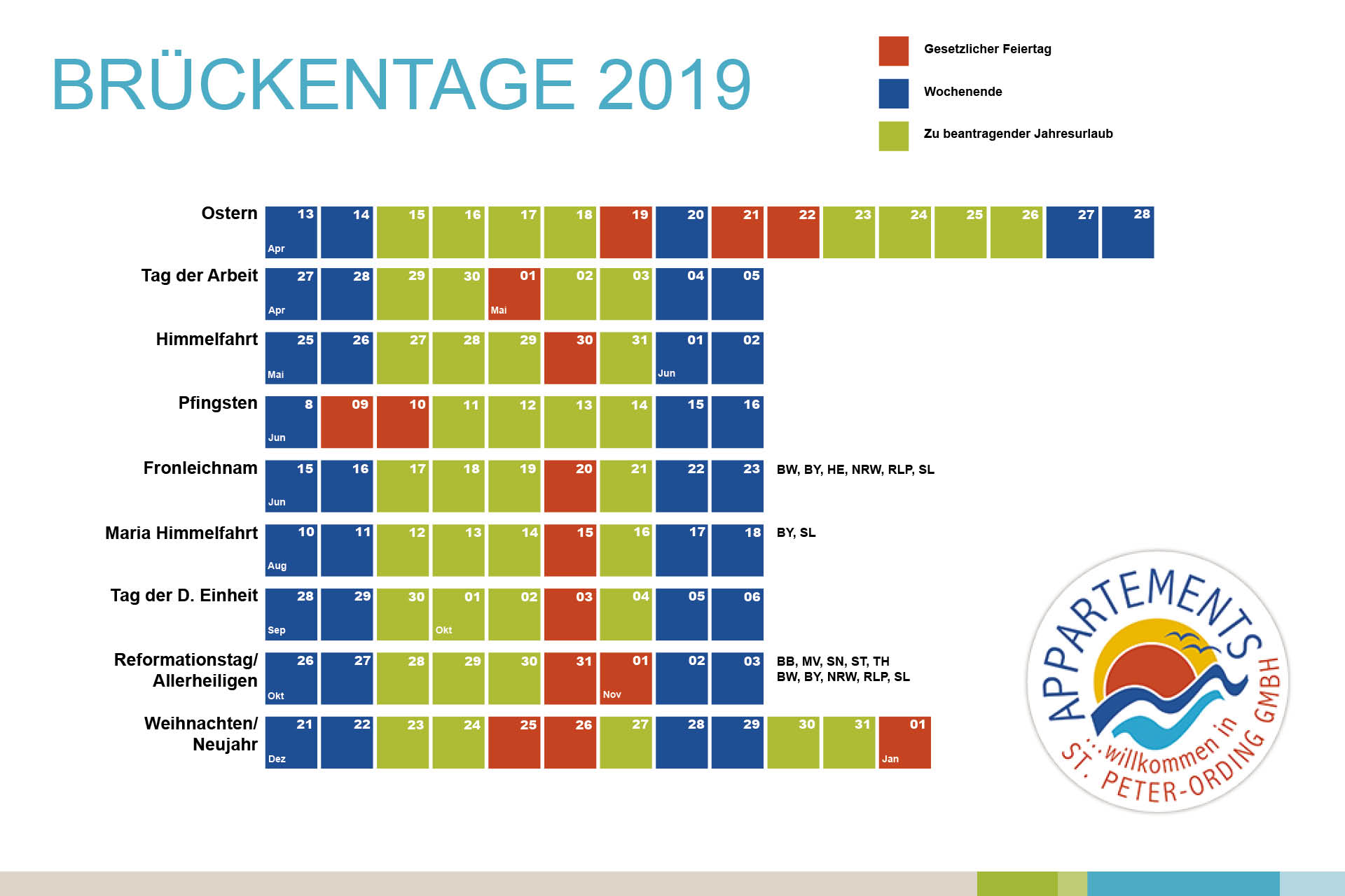 Wer möchte nicht dem Alltagsstress entfliehen und ein paar Tage Ruhe genießen? Die Seele bei einem Kurzurlaub an der Nordseeküste baumeln lassen kann wahre Wunder für Ihr Wohlbefinden bewirken. Die Urlaubsplanung für das kommende Jahr 2019 steht an und wir helfen bei der Überlegung des Urlaubs gerne. Beantragen Sie rechtzeitig Urlaub bzw reichen den ein oder anderen Brückentag bei Ihrem Chef ein, damit Sie die Feiertage und Brückentage voll auskosten können.