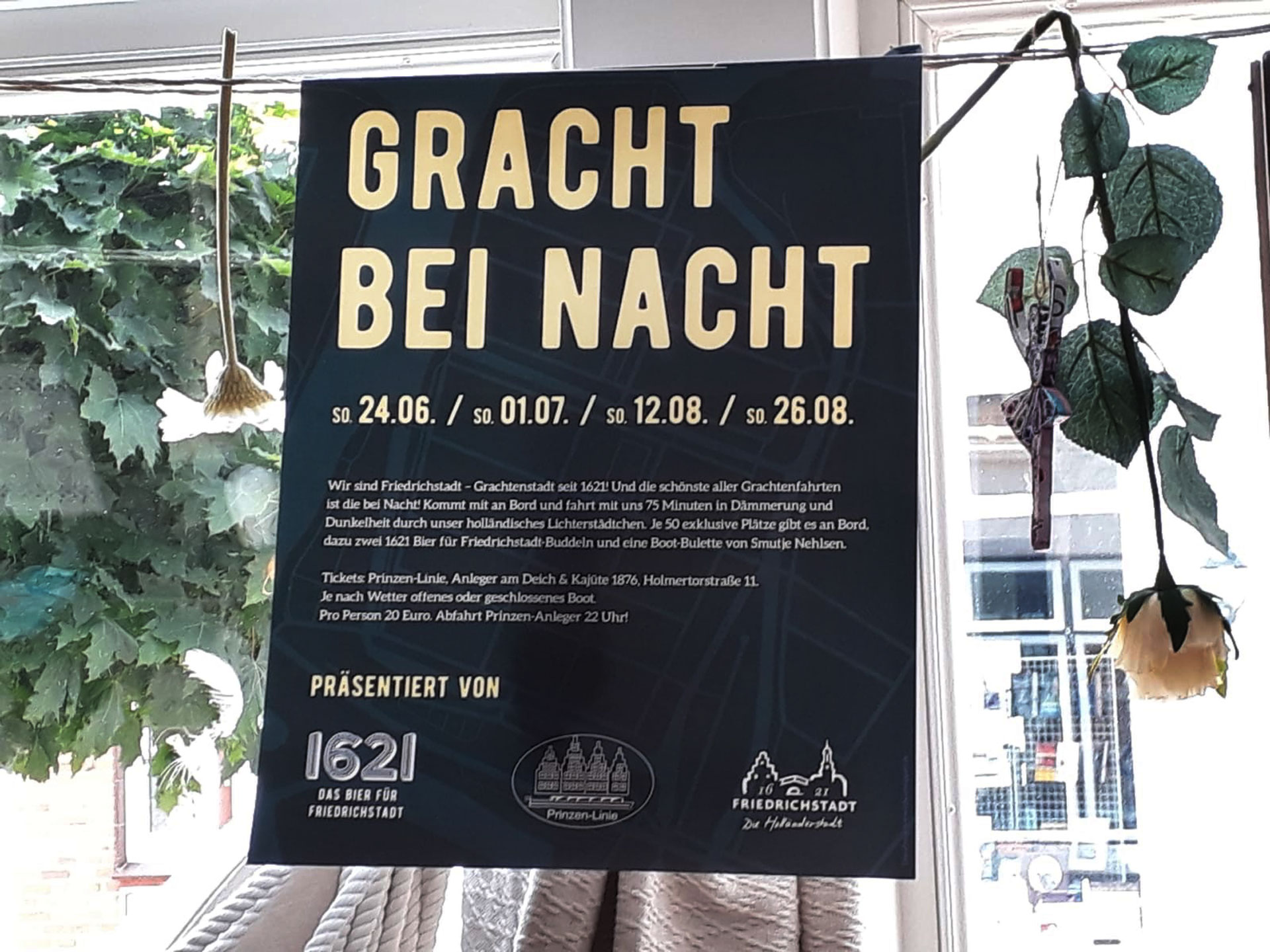 Je nach Wetterlage findet die Grachtenrundfahrt im offenen oder geschlossenem Boot statt. Die Veranstalter „Prinzen-Linie“, „1621“, „Tourismusverein Friedrichstadt“ und „Kajüte 1876“ freuen sich auf große Beteiligung und stehen schon in den Startlöchern. Die Tour beginnt um 22.00 Uhr und endet um 23.15 Uhr. Sie startet am Prinzenanleger, den Sie hier finden: