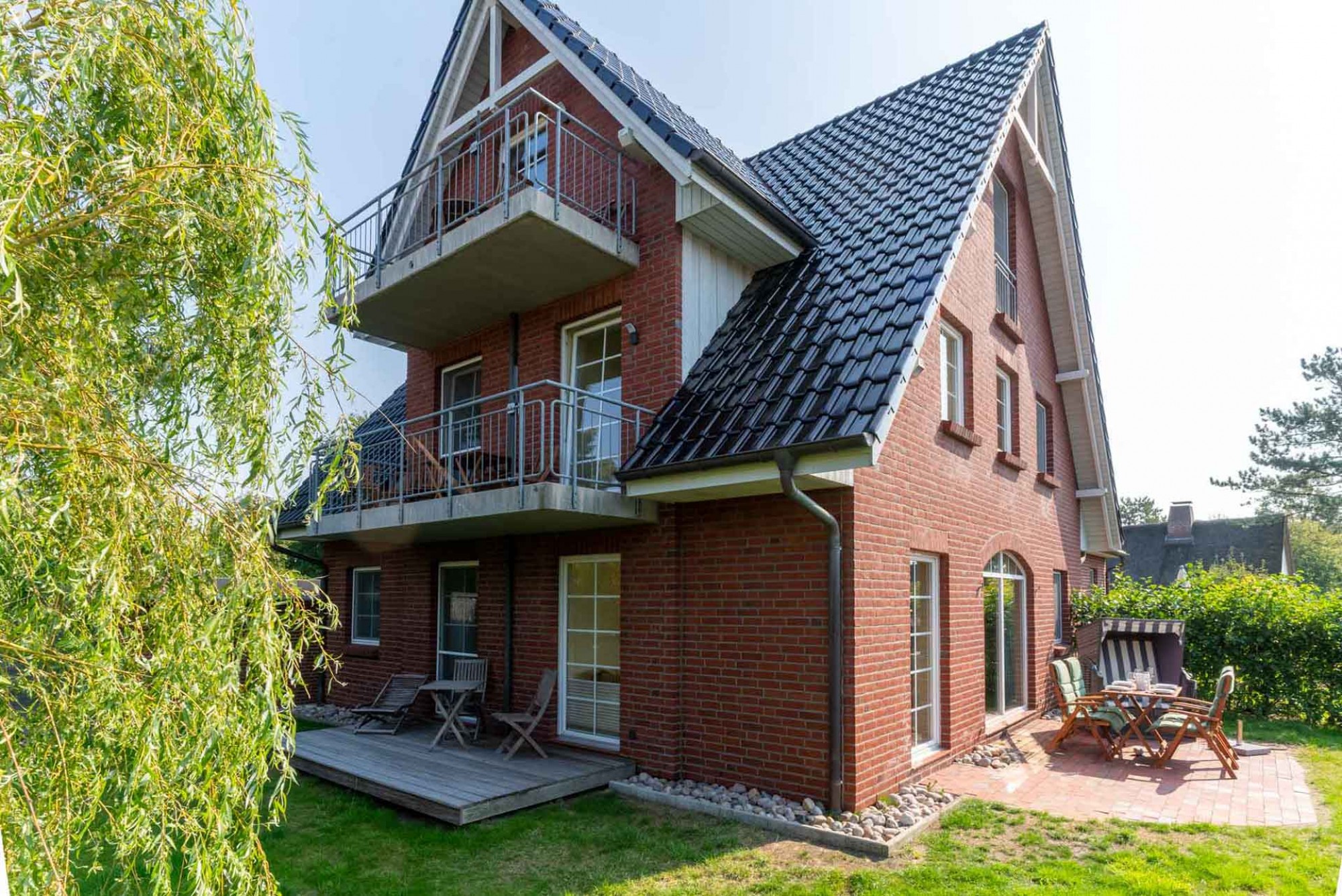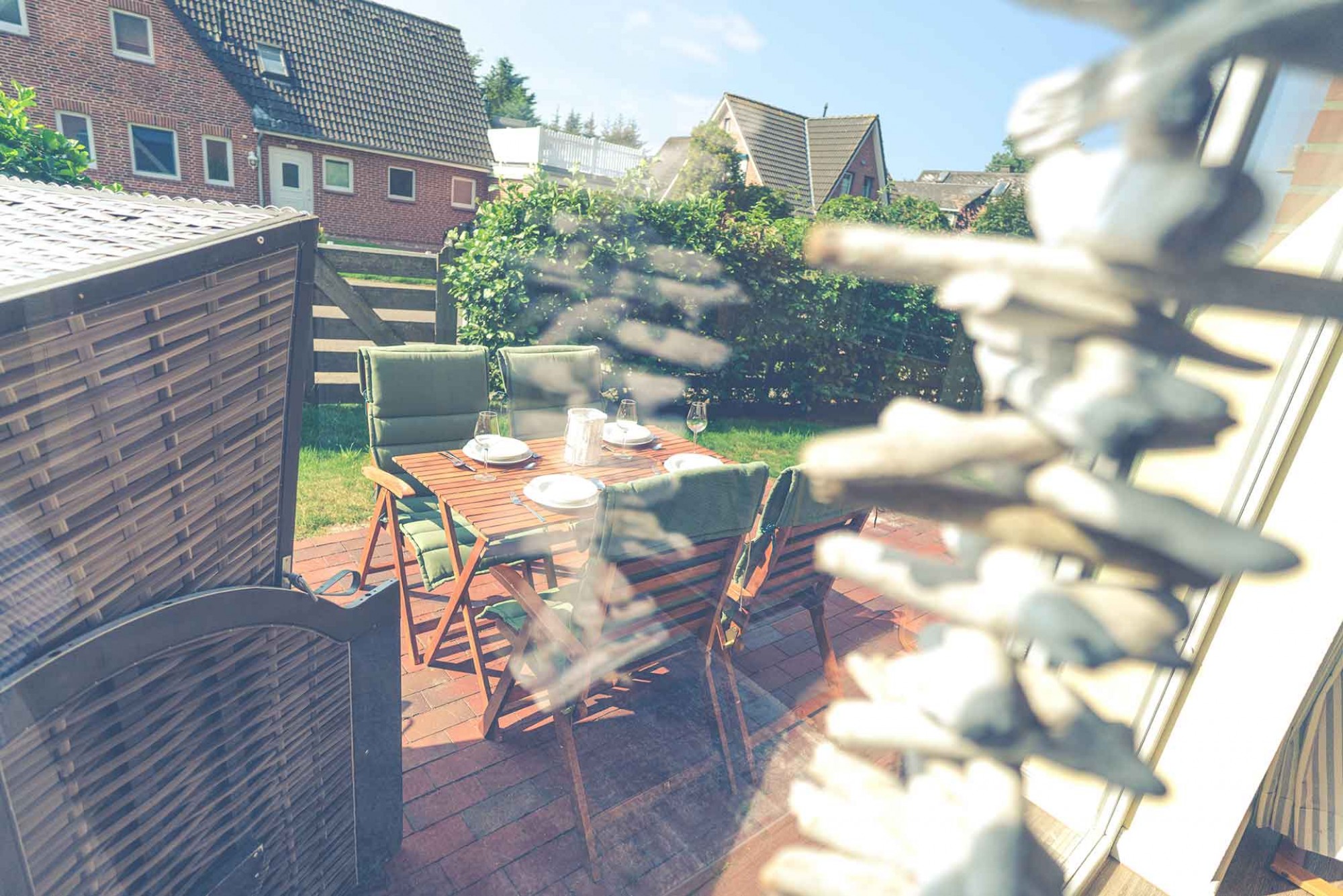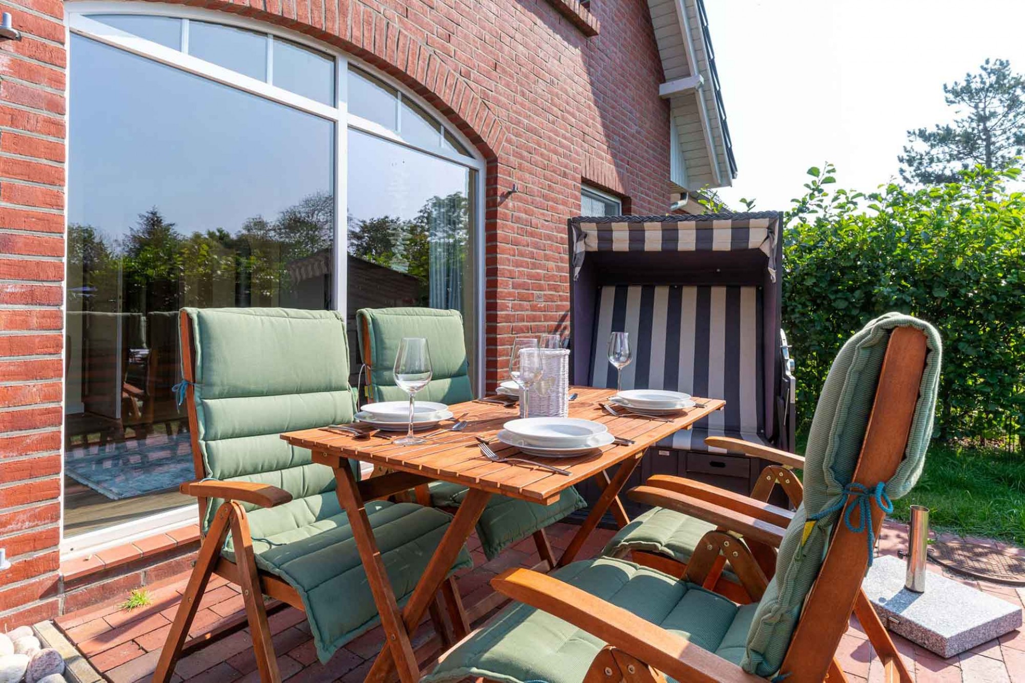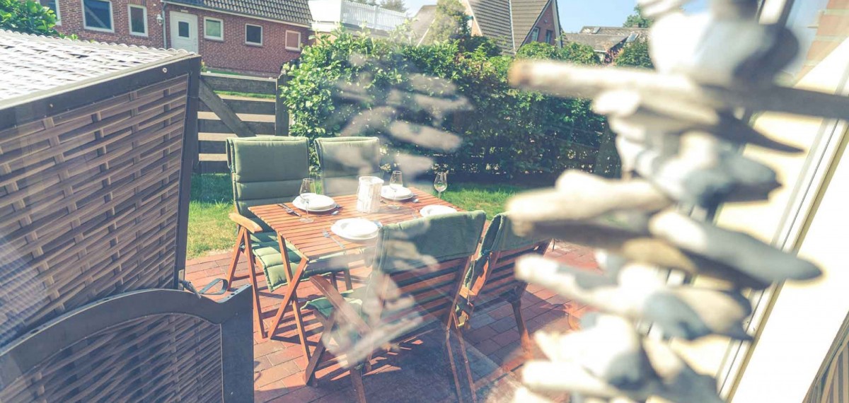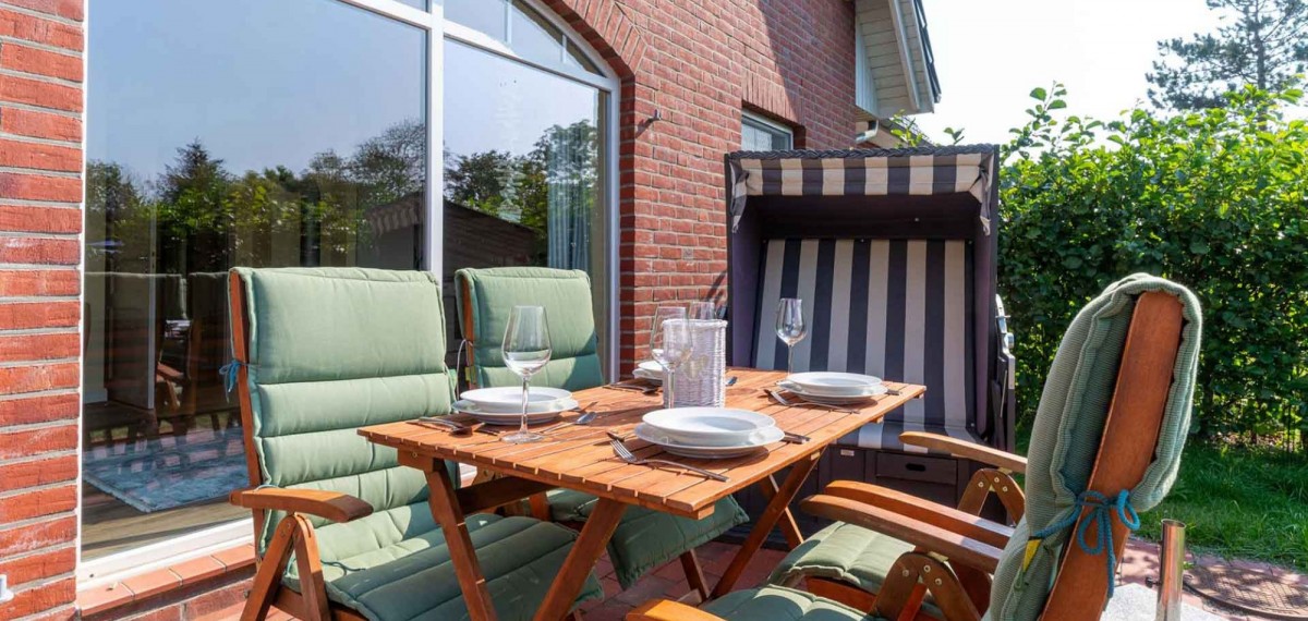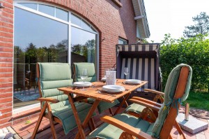 Auf der Südterrasse mit Holz-Gartenmöbeln und eigenem Strandkorb (April-Okt) oder auf der überdachten Westterrasse können Sie bei schönem Wetter ihre Zeit draußen verbringen.